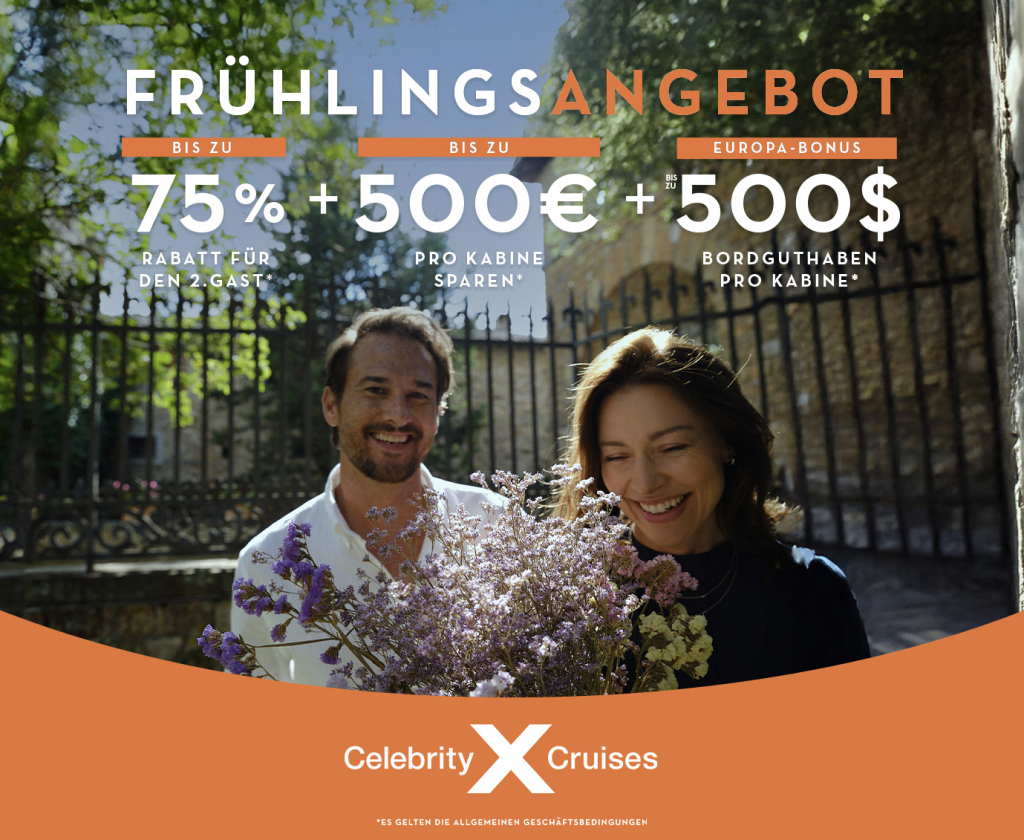 Im Rahmen eines weiteren neues Specials – es gilt vom 13. bis 30. April 2026 – gibt es zusätzlich auf ausgewählte Europa-Kreuzfahrten auch noch Bordguthaben in Höhe von bis zu 500 US-Dollar pro Kabine. Weitere Informationen bei Celebrity Central: https://celebritycentral.co.uk/campaigns/archive/dach-spring-sale-3-march-5-may-2026/.