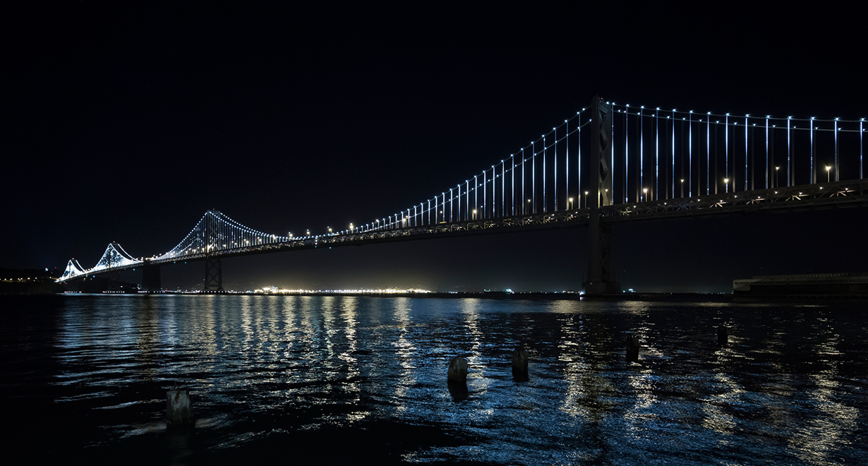 1989 zeigte die Erde, wer der Stärkere ist. Damals stürzte der östliche Teil der Bay Bridge ein. Ingenieure bauten daraufhin einen faktisch erdbebensicheren Nachfolger – dieser wurde 2013 fertig gestellt. Bis dahin führte die Bay Bridge ein Schattendasein im Vergleich mit der berühmten Golden Gate Bridge. Das sollte sich mit der Lichtinstallation durch den Künstler Leo Villareal schlagartig ändern.